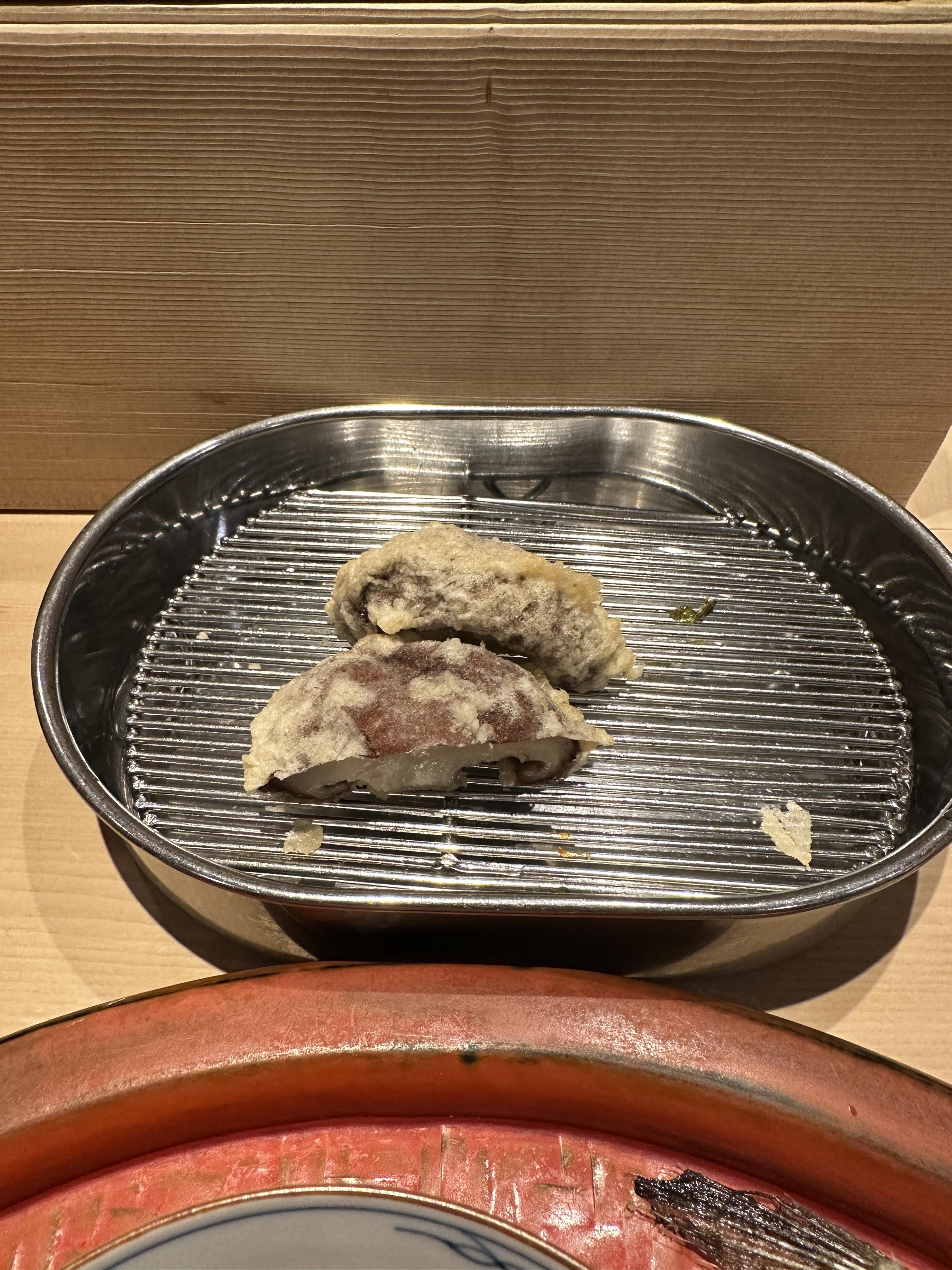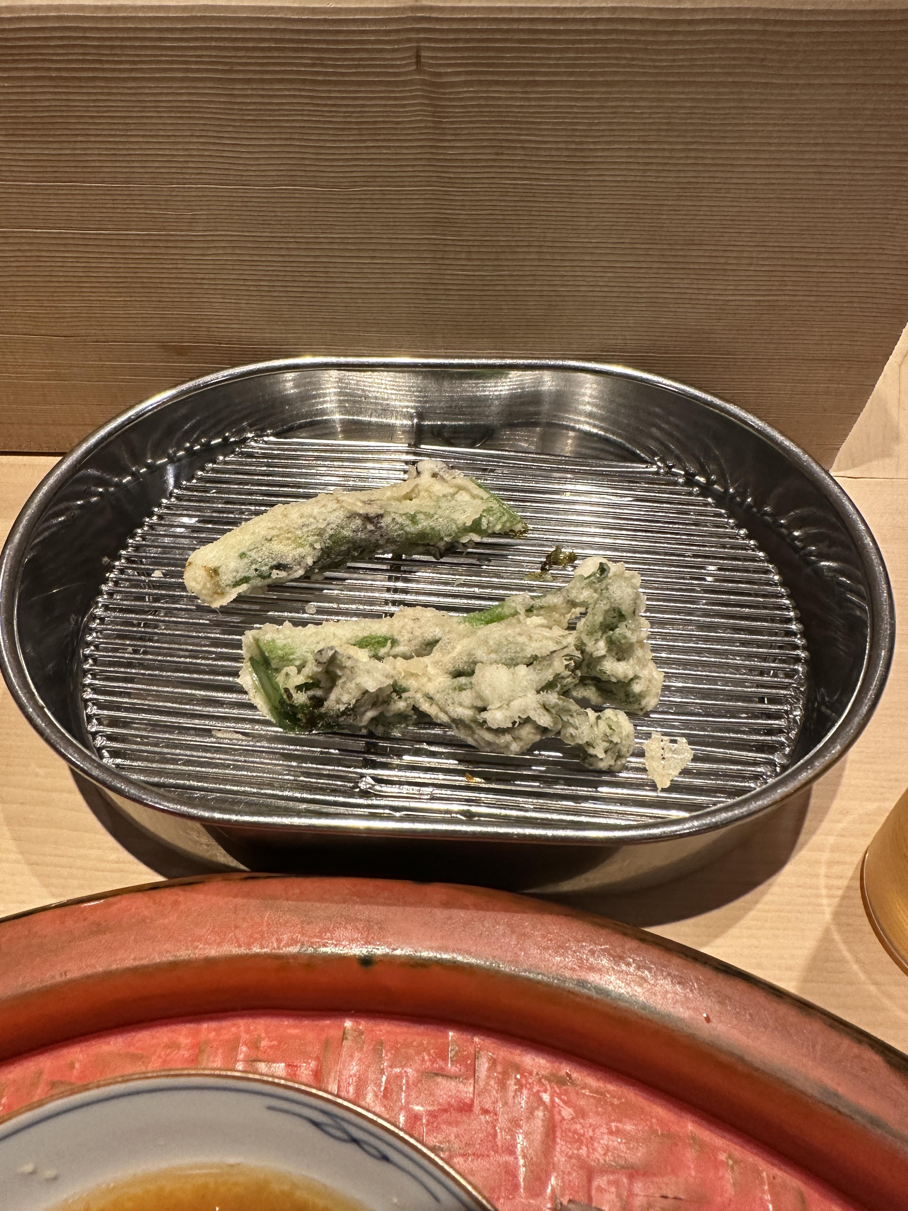 우니 시소 튀김은 말할 필요가 없이 3명이 동시에 쳐다볼 정도로 충격적이었고, 두릅, 땅두릅, 아스파라거스 또한 너무나도 뛰어난 맛이었다. 채소가 이렇게 감칠맛이 강하게 나는 건 역시 일본뿐인 건가 생각이 들었다. 입가심을 위해 병맥주도 시켜서 같이 마시기 시작. 표고버섯과 장어튀김. 아주 부드러웠다. 끝을 달리고 있었다. 튀김만 벌써 20개 이상이 나왔기 때문에 더는 불가능했다.