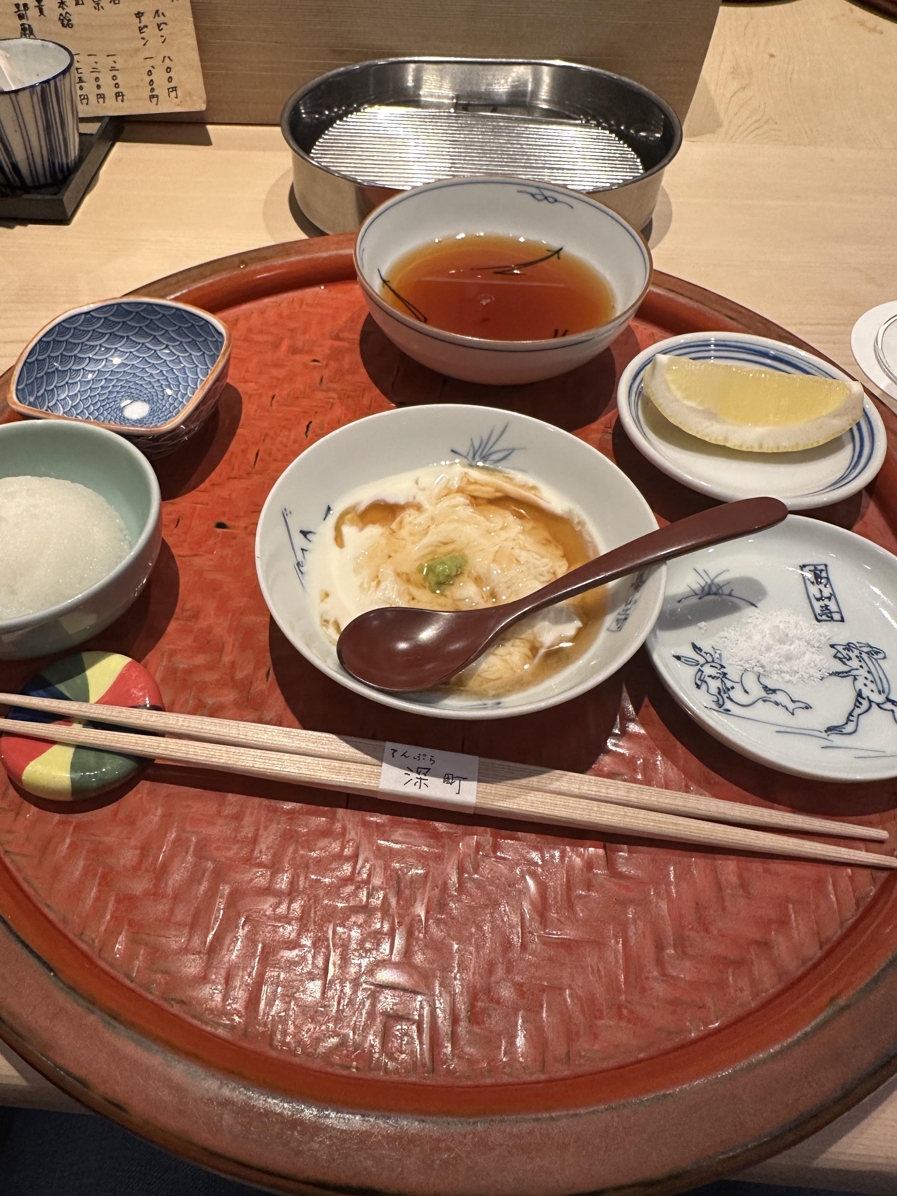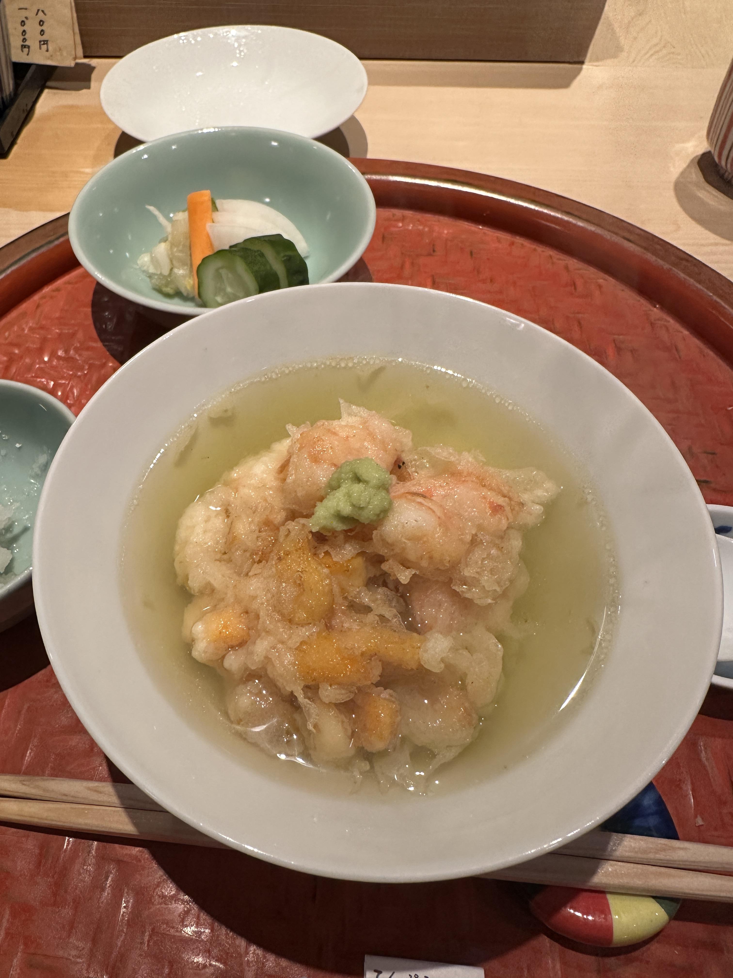 처음에 모찌리도후 같은 부드러운 식감의 음식. 위를 보호하라고 주는 거겠지? 잘 먹고 바로 튀김 시작. 가족경영이라 아버지와 아들이 텐푸라를 튀길 준비를 하셨고, 새 기름의 향이 매장에 진동했다. 이름 모를 생선튀김, 그 뒤에 시카코 튀김 이게 말이 되는 건가 이렇게 입안에서 폭발적인 맛과 향이 나는 시라코라니.. 크리미의 끝. 완벽했다. 보리새우 대가리 튀김. 몸통은 꼿꼿하게 튀겨져 나왔고 술안주로 딱. 키스(보리멸) 튀김은 빠삭하다는 표현이 맞을 정도로 바삭거렸다.