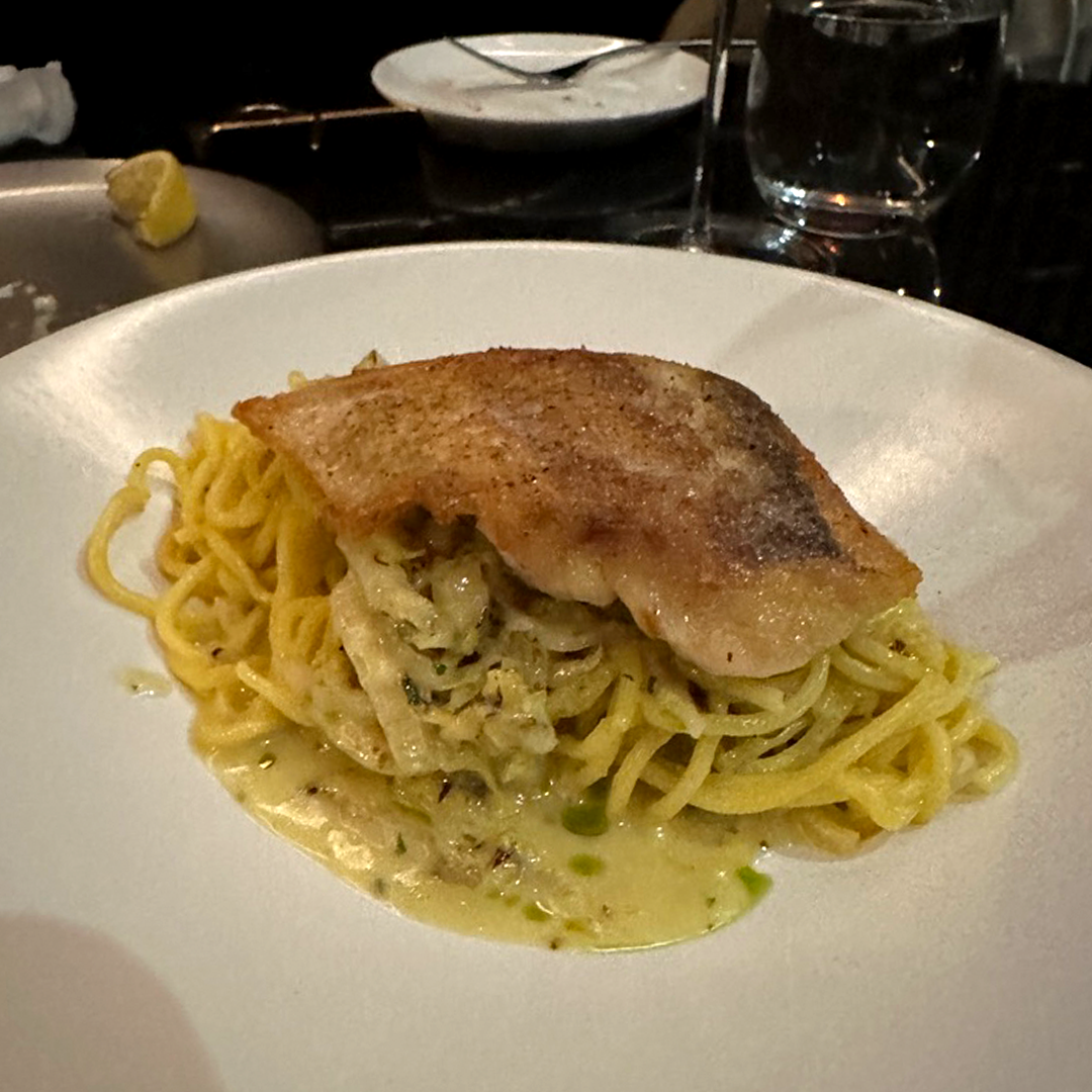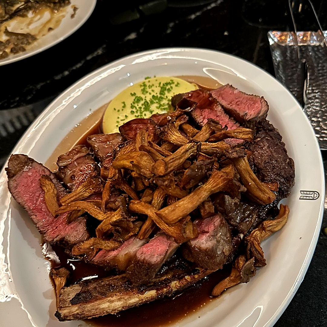 생면 파스타는 쫄깃한 식감이 와인과 잘 어우러졌으며, 이날 최고의 메뉴는 스테이크였습니다. 약 1킬로그램 정도의 스테이크는 4명이서 충분히 나눠 먹을 수 있는 양이었고, 적당한 미디움 굽기로 훌륭하게 조리되었습니다. 위에 올려진 느타리 버섯도 맛과 어우러짐이 뛰어나 인상적이었습니다.